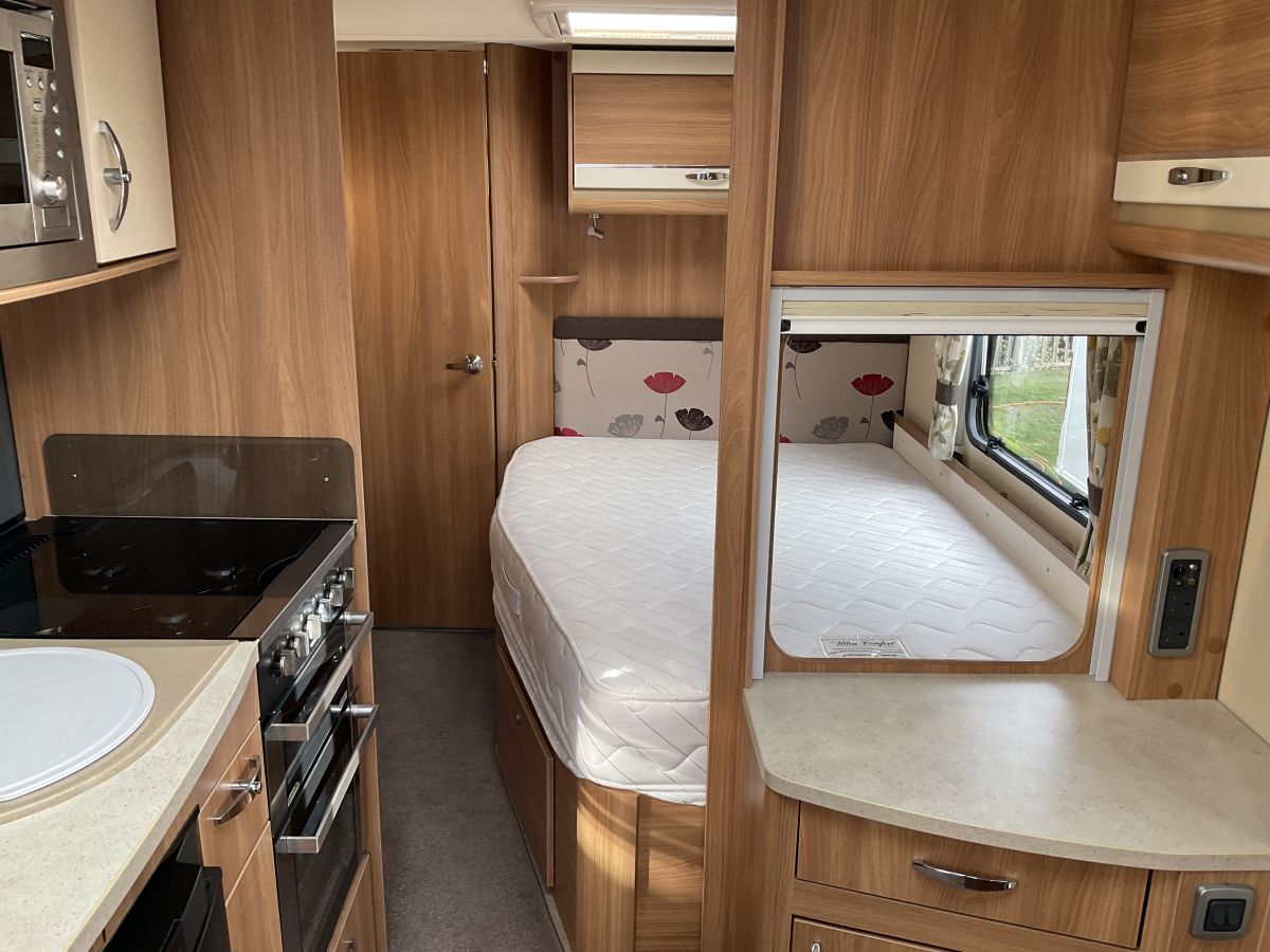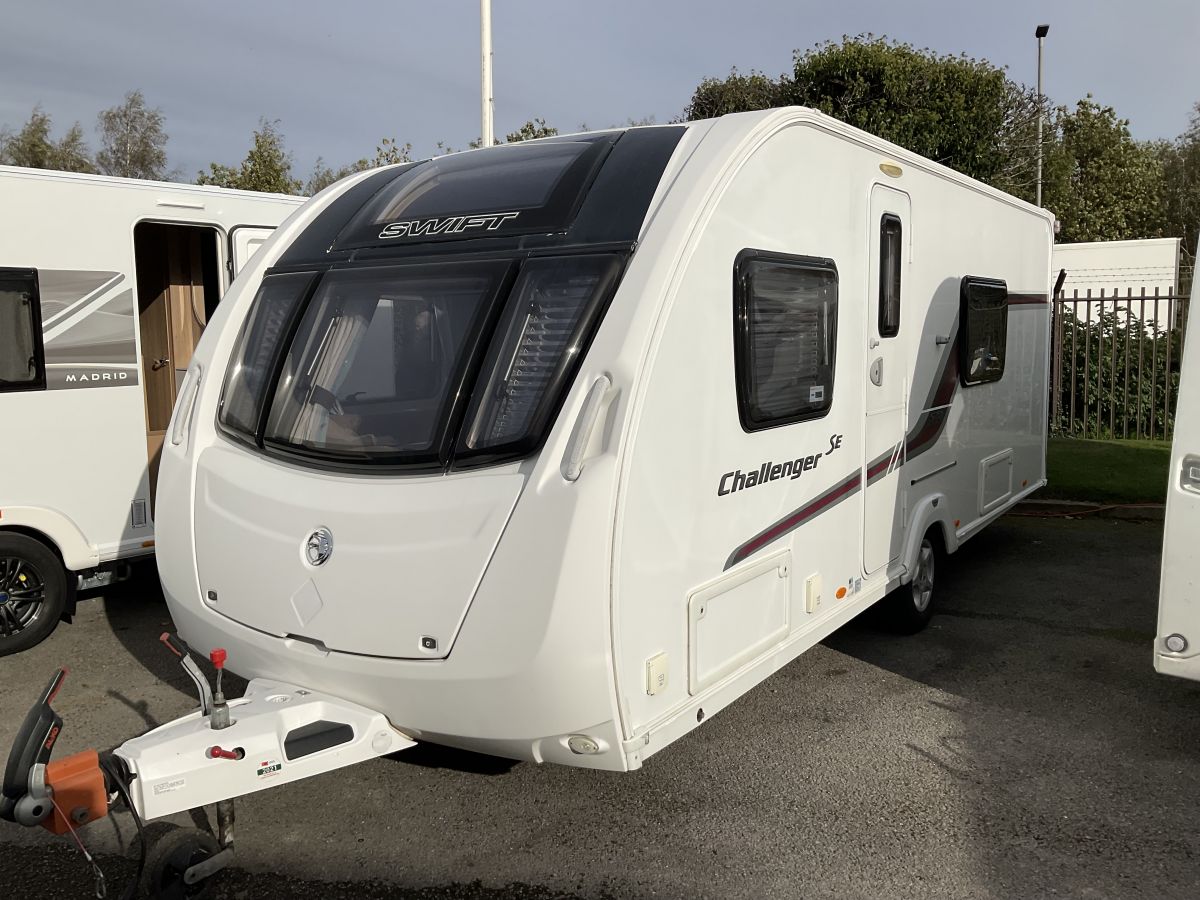 Great qquality, high spec single axle 4 berth Swift with great layout of front lounge, fixed double bed and spacious end washroom with separate shower cubicle. Modern interior and finished and complimented with large front panoramic window and Truma Air-con