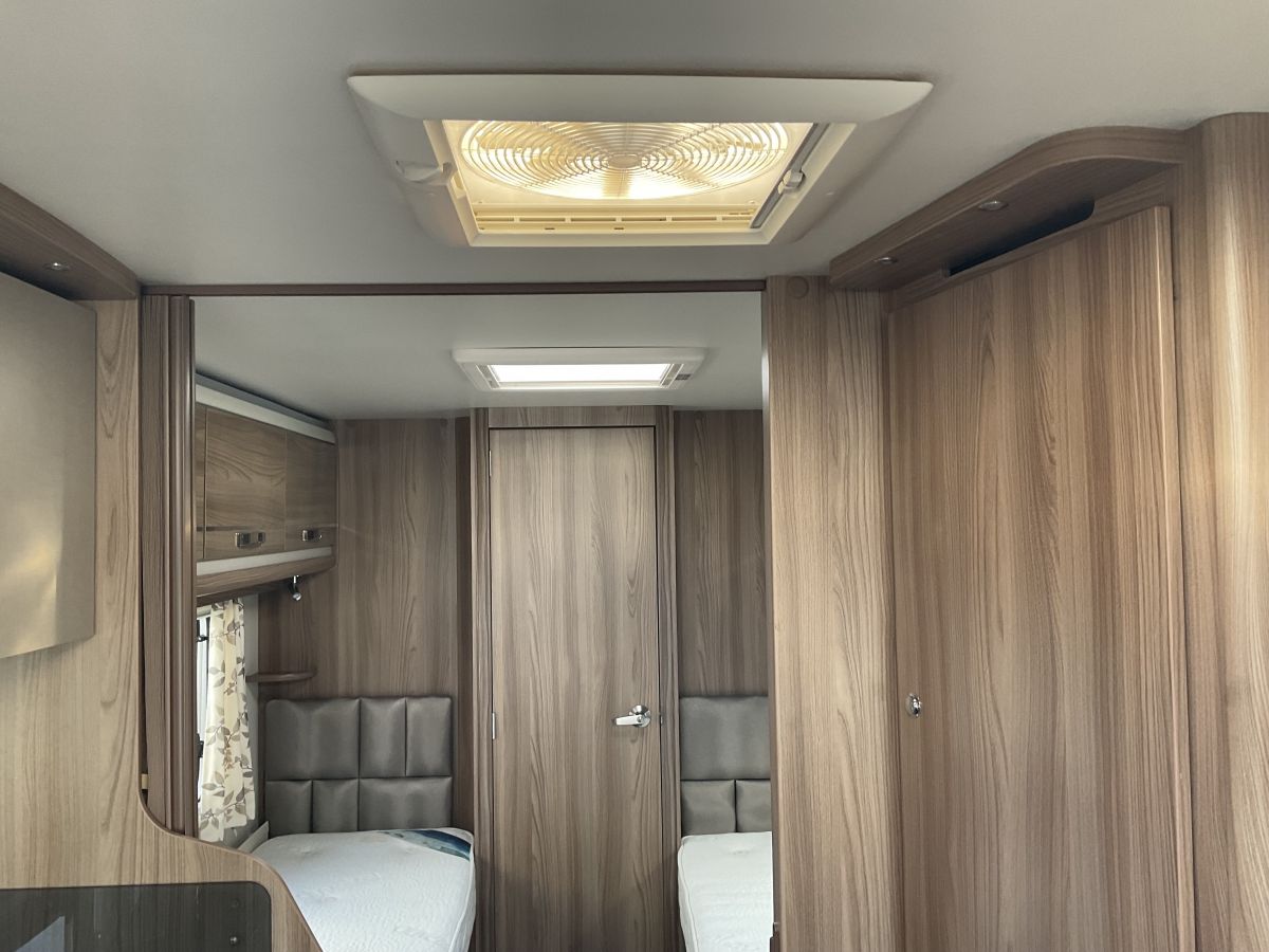 Gorgeous condition, high spec dealer special model with the hugely popular layout of large front lounge, fixed single beds and full end washroom with shower cubicle. Modern interior with plush furnishings and large front panoramic window letting in loads of light. Great example complete with auto-engaging Powrtouch mover