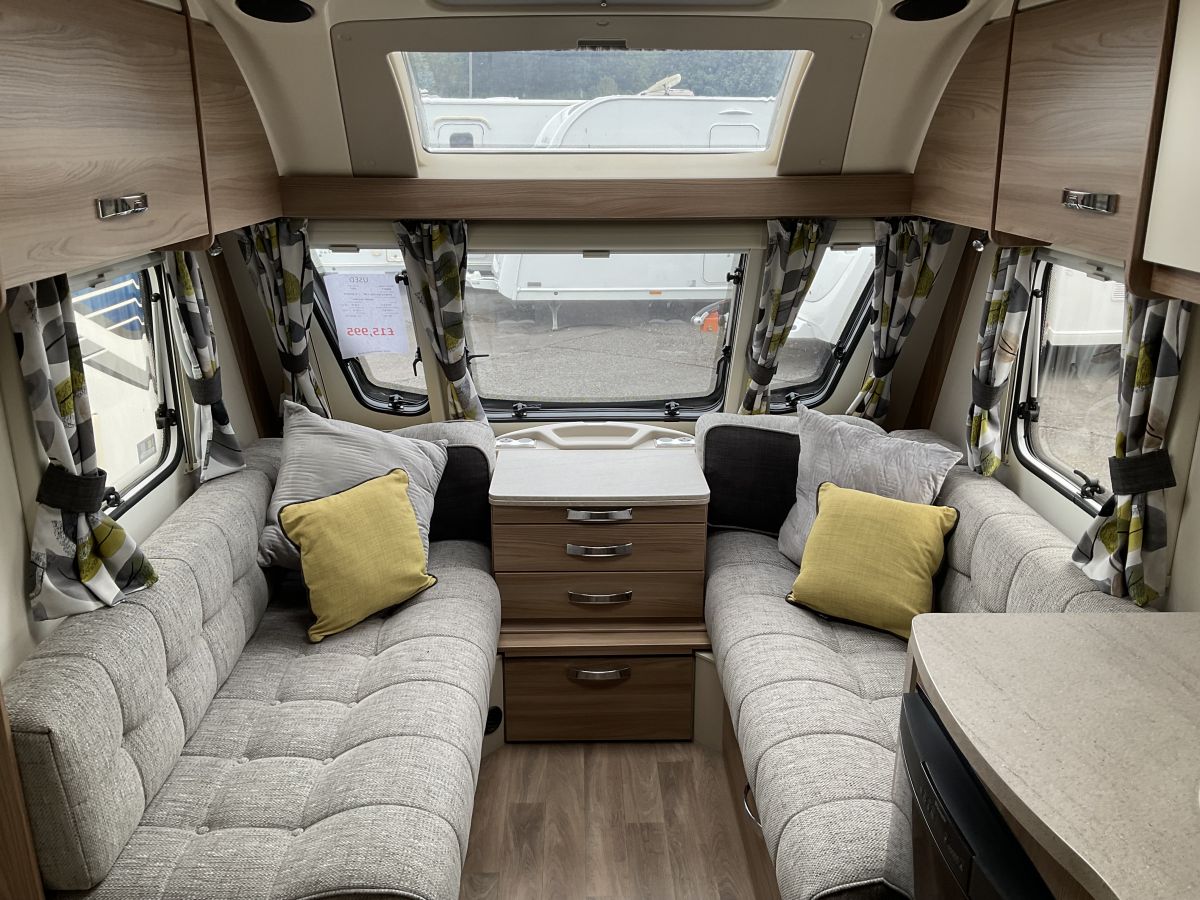 Lovely condition, motor mover included Swift Sprite with the popular layout of front lounge, transverse island double bed and full end washroom. Really lovely feel throughout made bright and airy with large front panoramic window. Modern and neutral upholstery give this caravan a contemporary feel