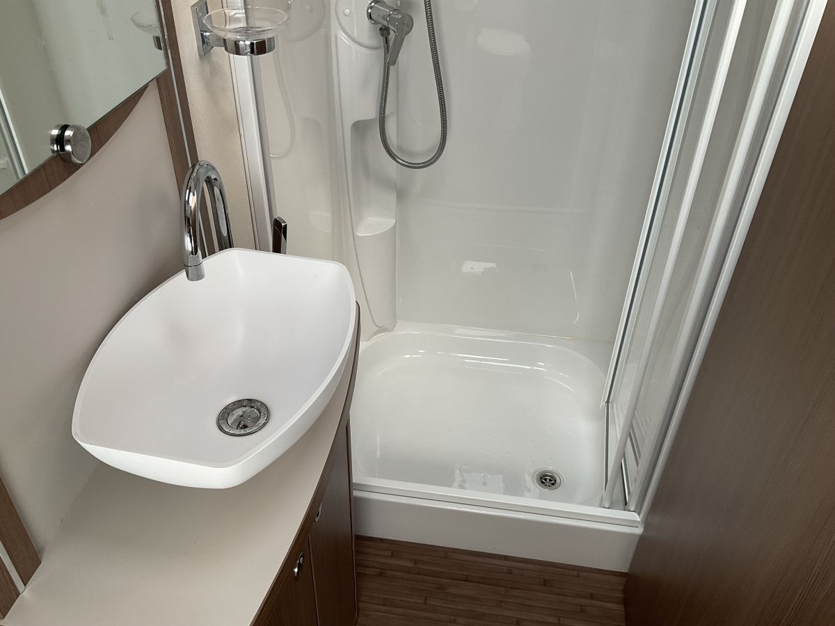 Really nice condition, high spec top of the range 4 berth single axle modern and bright Elddis with the great layout of front lounge, transverse island double bed and full washroom across the rear with good size shower. The large front panoramic window gives this model a really bright and airy feel with light grey neutral upholstery scheme. Complete with Powrtouch Motor mover
