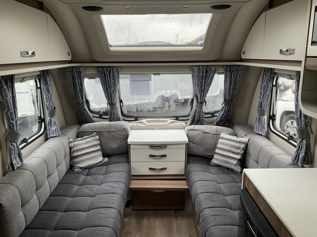 Lovely condition, 4 berth single axle lightweight Sprite with full end washroom and transverse island double bed. Really modern example with modern upholstery, large front panoramic window and complete with Powrtouch Mover