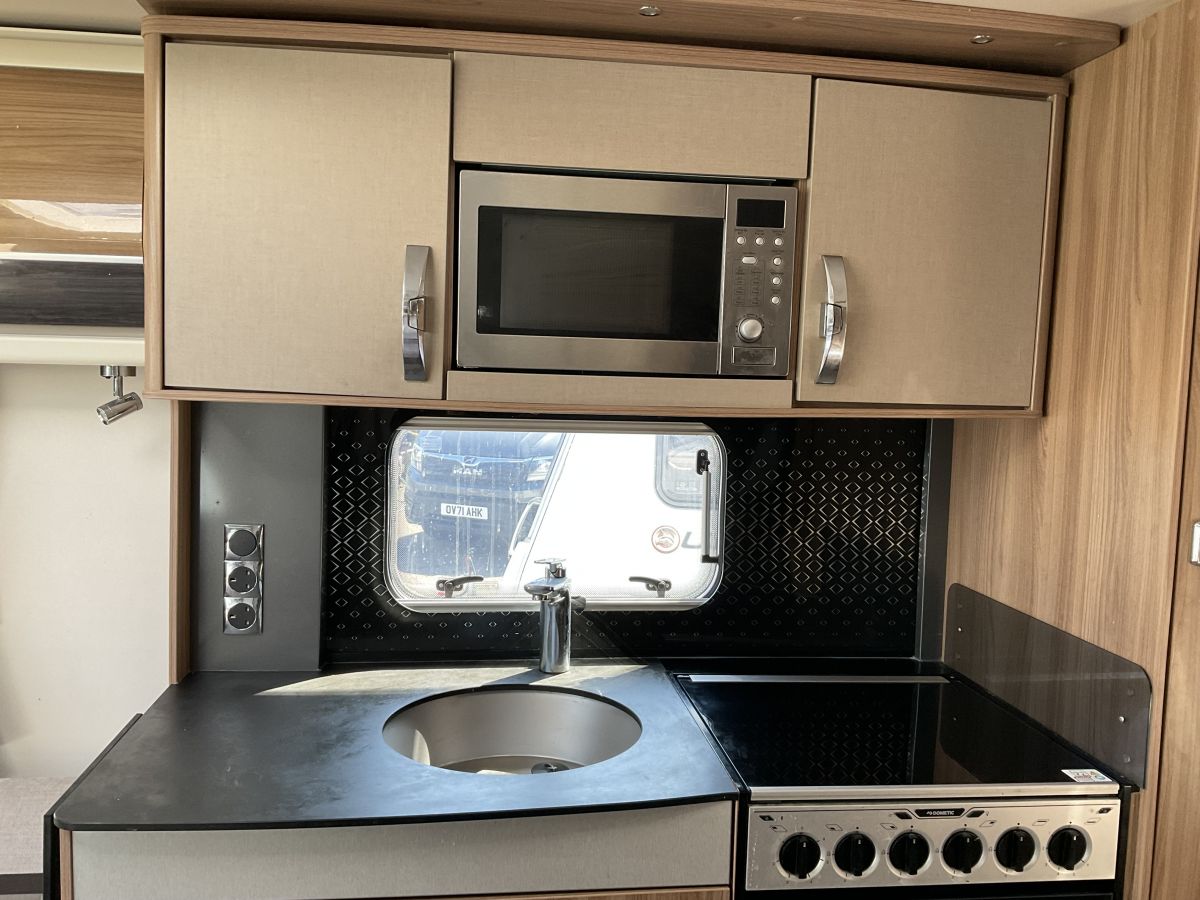 Beautiful condition, 8 foot wide twin axle and high spec model with front lounge, transverse island double bed and full end washroom with shower cubicle. Packed with lots of extras the Swift has a really modern feel with a bright and airy interior with modern fabrics and large front panoramic window letting in loads of light. Motor mover included and 12 months warranty supplied