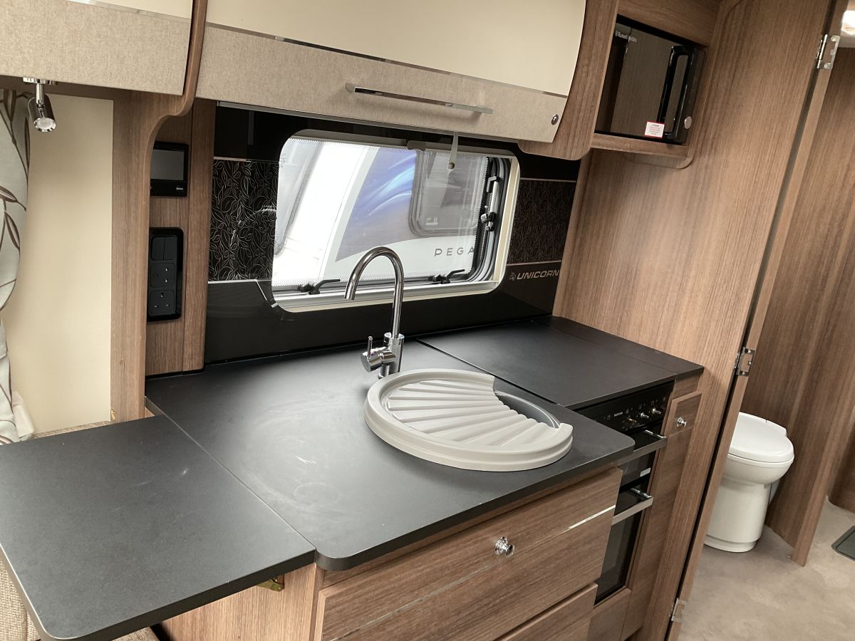 Lovely condition top of the range twin axle Bailey Unicorn Pamplona complete with Powrtouch motor mover. Lovely layout of huge front lounge, central washroom and end bedroom with forward facing island bed. Bright and modern interior with neutral upholstery scheme