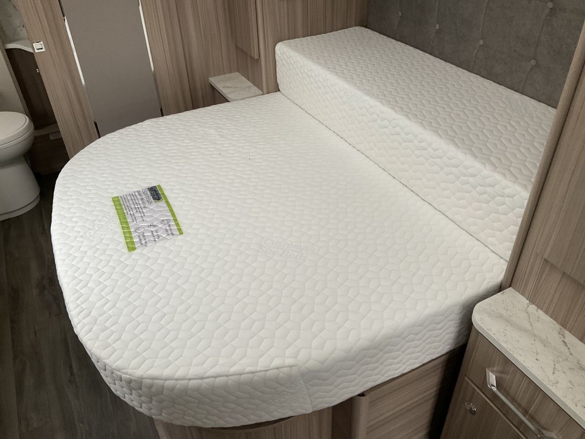 Immaculate condition 4 berth single axle high spec and even higher quality Dealer special based on the Acadia. Cracking layout of front lounge, transverse island double bed and rear washroom with shower cubicle. Really bright and modern feel throughout with high end furnishings in a neutral colour scheme. Large front panoramic window gives this model a really airy feel