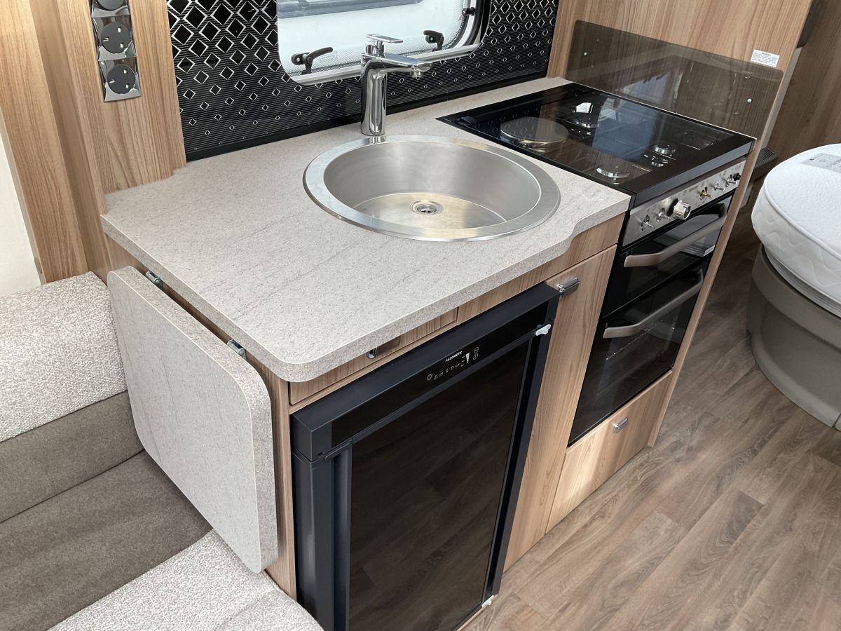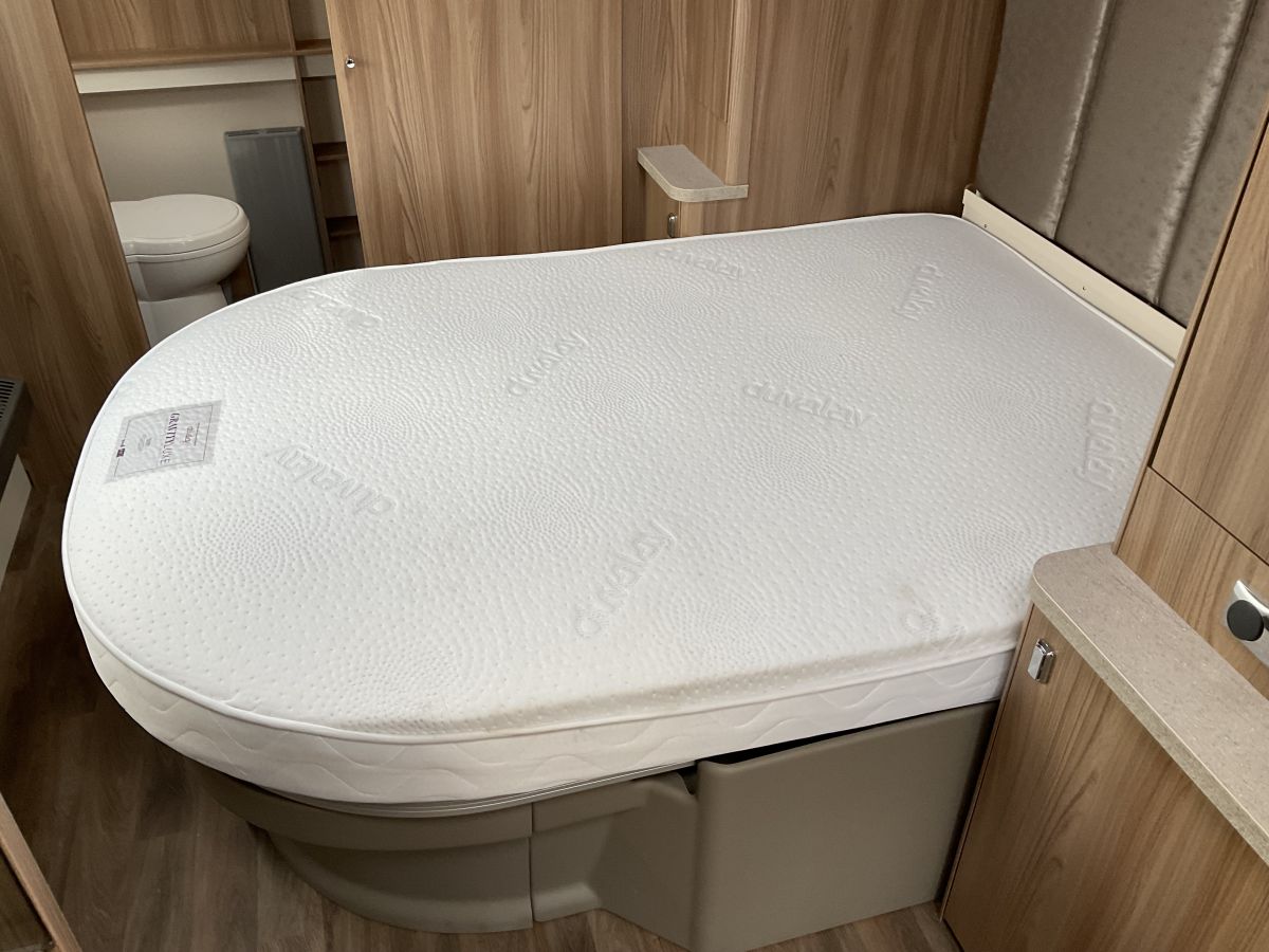 Lovely condition, 4 berth single axle, high spec 8 foot wide Swift with a cracking layout of large front lounge with central chest and large panoramic window. The lounge leads past the kitchen to a transverse island double bed and then end washroom with shower cubicle. Great modern interior packed with features and a stylish finish