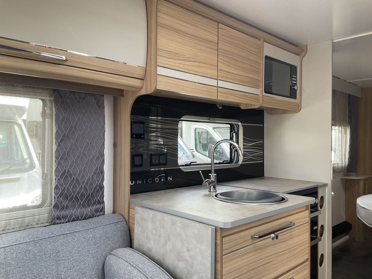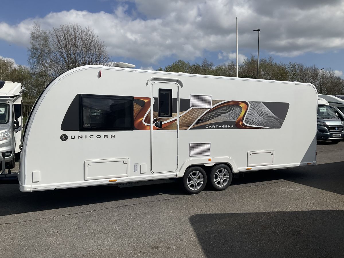 RARE. One owner from us with full service history, Twin axle top of the range single axle Bailey Unicorn Cartagena with the highly sought after layout of huge front lounge, transverse island double bed and full end washroom with shower cubicle. Modern and bright interior with neutral grey upholstery and large front panoramic window letting in loads of light