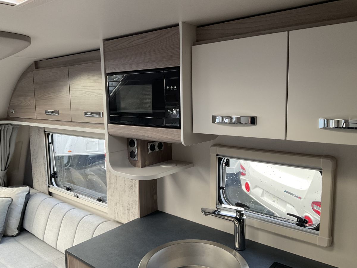 Lovely condition, 8 Foot wide twin axle dealer special model packed with extras. Great layout based on the Quattro Grande EB of huge front lounge, central washroom with Jack n Jill doors leading through to an end bedroom with large forward facing fixed island double bed. Must be seen, modern and neutral airy interior with modern styled external finish