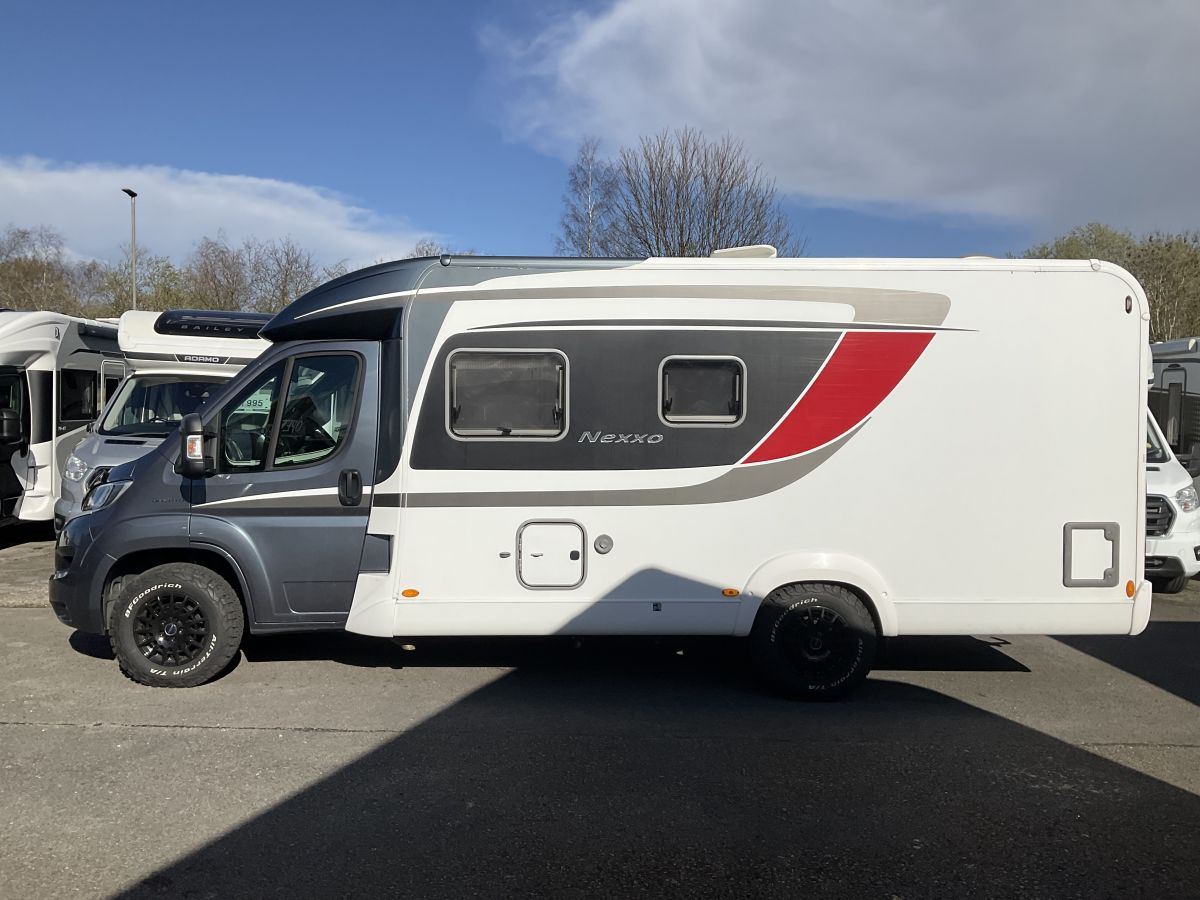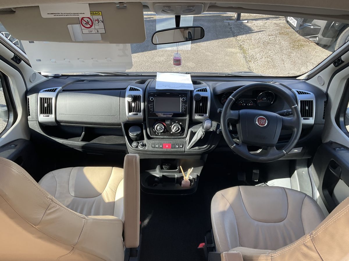Really lovely, modern styled Automatic 4 berth and 4 seatbelt low profile Burstner complete with a brand new set of All-Terrain tyres. Lovely styled motorhome with modern graphics, leather upholstery and a great layout of front lunge with large living space, fixed double french bed and corner washroom with separate shower cubicle. The cab area houses an auto gearbox and swivel seats that expand the living area. Lovely example with 12 months warranty, services, MOT and 6 months RFL