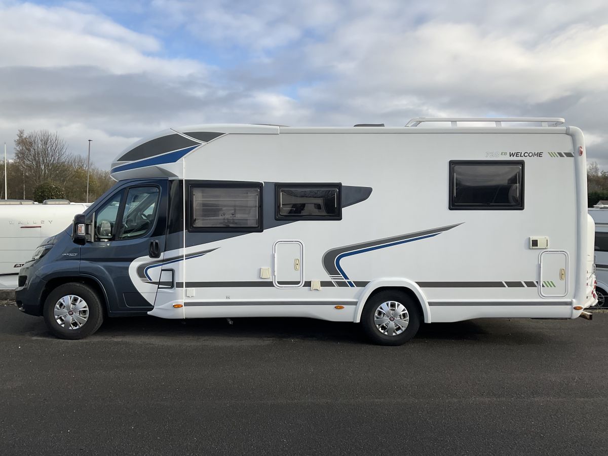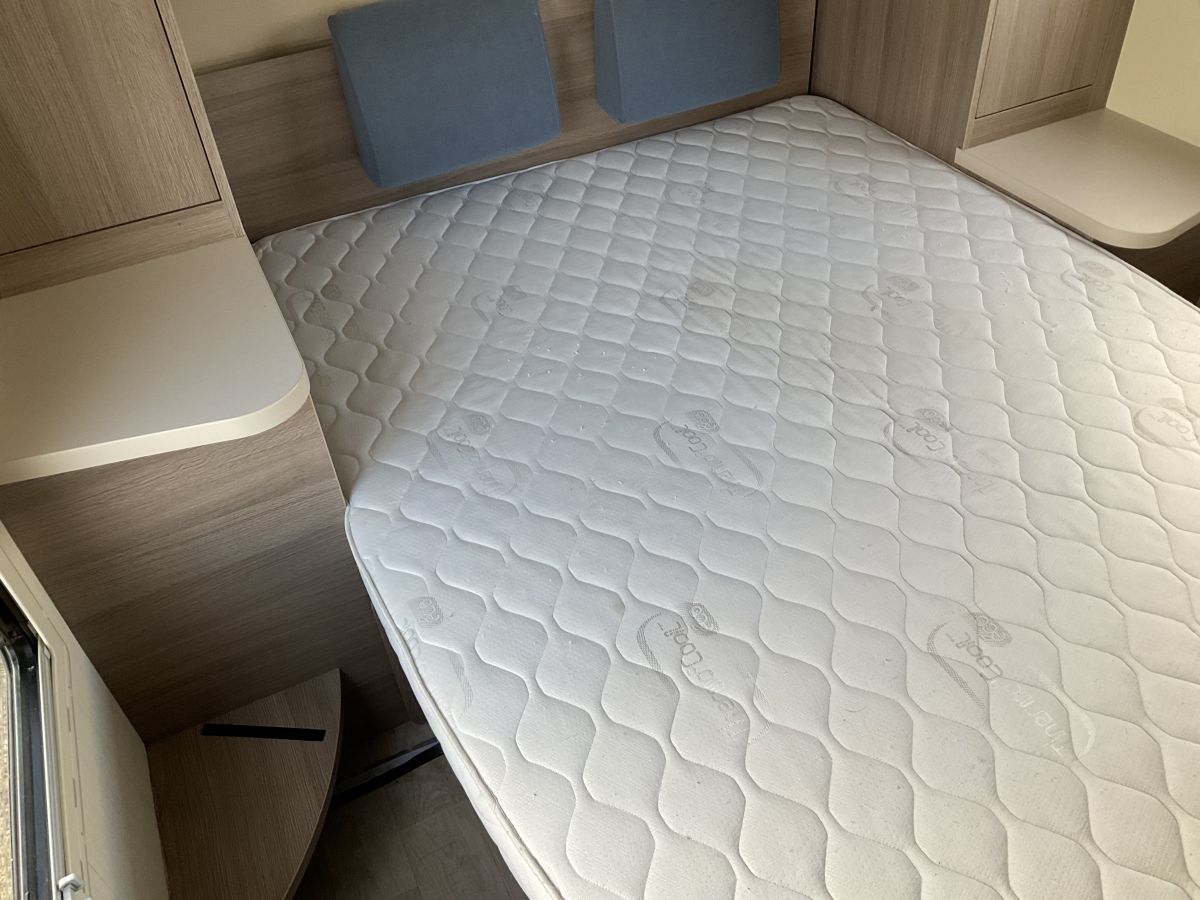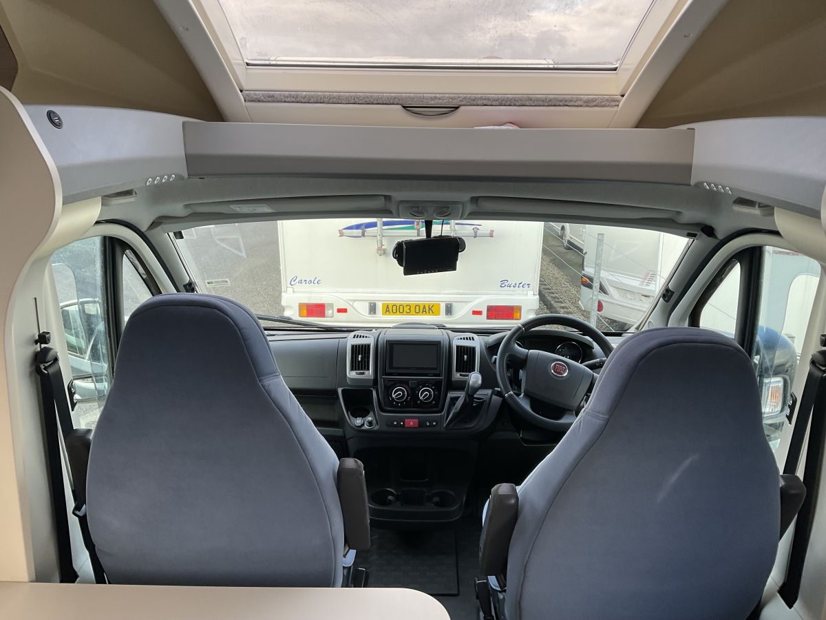 Really lovely condition, great layout of large L-shape lounge with 2 extra forward facing travelling seats, central washroom and end bedroom with forward facing island double bed. The raised island bed allows for a huge external garage underneath whilst the quality of trim and cupboards is of a very high standard. Automatic gearbox with just 35138 miles