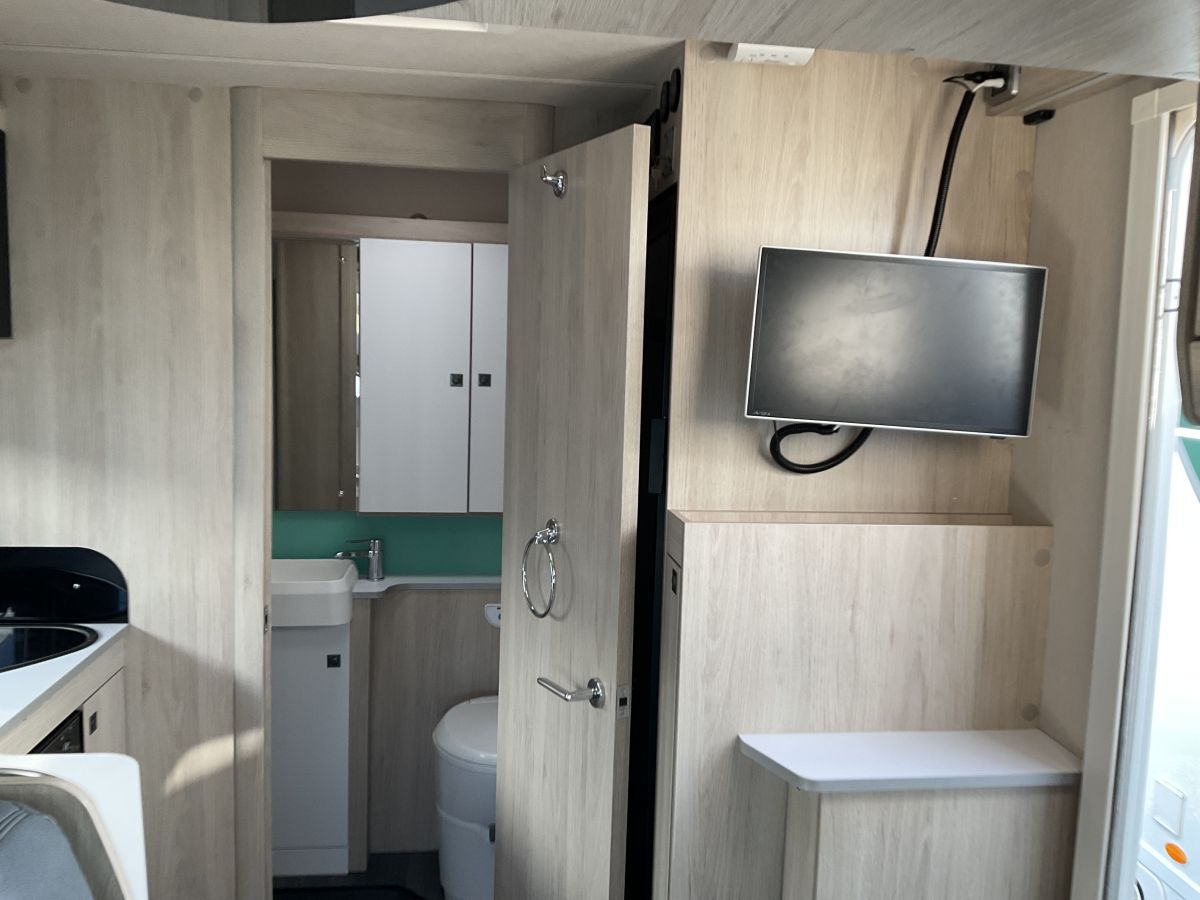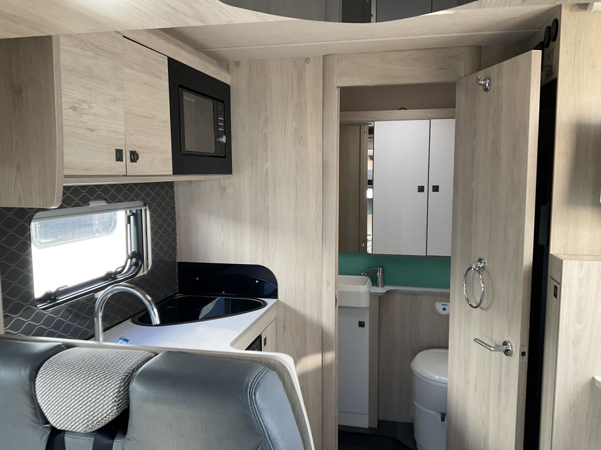 Nearly new, low mileage 11518, low profile and compact Automatic Autotrail with the most popular layout currently on the market. This compact modern and sleak model has a lovely airy front lounge which converts to a double, electric drop down double bed and end washroom and kitchen whilst managing to squeeze in a slimline rear garage space. Full warranty, services, MOT and 6 months RFL all included
